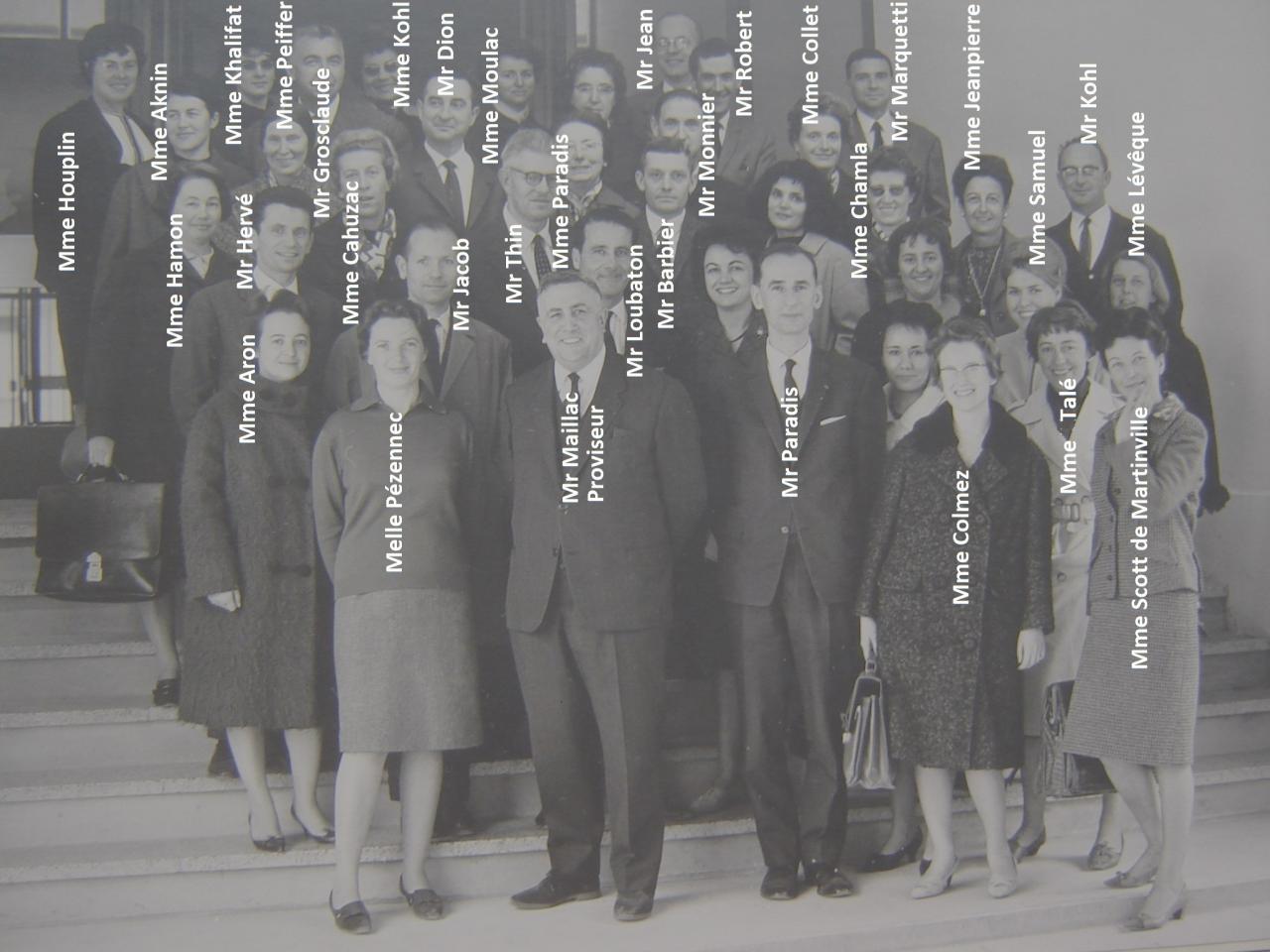 Cette photo récapitule une bonne partie des professeurs que j'ai eus lors de ma scolarité à Descartes, commencée en 6ème5 et finie en terminale D 2: entre autres Mmes Talé (en allemand en 4ème je crois) et Paradis (en français en 6ème) et Mrs Dion (en 3ème je crois), Barbier (en 5ème) et Jacob (6ème et 4 ème). Je pense avoir eu Mmes Aknin et Hamon, sûr pour la première et moins pour la seconde